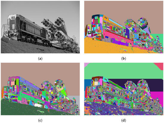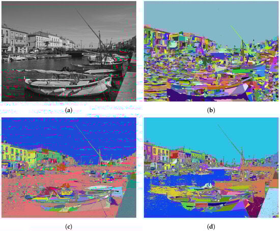In Figure 8, the results of image segmentation with the RSM are displayed. Different distance metrics d, described in Section 3, were used. For visualisation purposes, the segments are coloured with randomly selected colours, with the limitation that adjacent segments do not have the same colour. Such colouring enables distinguishing between adjacent segments.