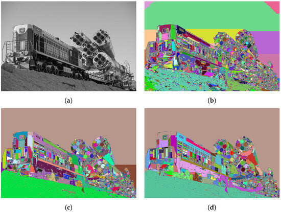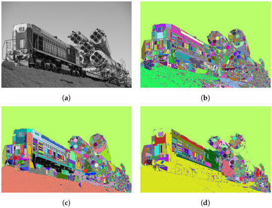 Figure 9 shows region segmentations of the image Train with different values of (limited to the range that produces sensible segmentation results). The distance metric was used for the segmentation. Table 4 shows the number of segments for the test images according to different values of . Smaller values of cause the segmentation to yield higher . Furthermore, by selecting too small a value of , the RSM tends to over-segment the image (as seen in Figure 9b). Therefore, it is sensible not to choose values that are close to 0. On the other hand, an that is too large can lead to a failure in extracting segments with soft edges (e.g., in Figure 9d, where the ground and the bottom part of the train are merged into a single ).