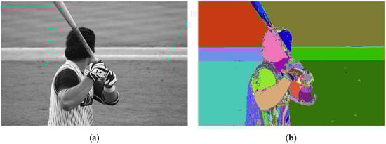 Examples of region image segmentations of the test images Baseball, Stop Sign, and Taxi are displayed in Figure 11, Figure 12, and Figure 13, respectively. After the segmentation is performed, it can be seen that regions with low variance in pixel values form common segments while the important image details, such as edges and vertices, are preserved. Following this, the parameters d, , and were tuned manually, so that the segmentation yielded the best visual results. Although the majority of the regions were detected as expected, we can observe that some parts of the image are over-segmented (especially noticeable in Figure 12 below the Stop Sign).