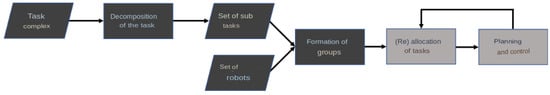 To manage the execution of cooperative tasks in multi-robot systems, the workflow involves breaking down complex tasks into simple subtasks based on the robots’ capabilities, which are grouped accordingly, to then perform the scheduling, planning, and control of tasks among the robot groups, which autonomously carry out the assigned tasks [], as shown in Figure 1.
