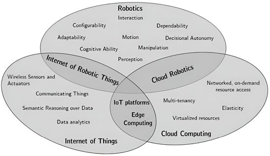 Taking into account that several robotic systems request scalable services for the computational processes they execute, these systems are can be integrated into a Cloud Computing infrastructure, amounting to what is known as Cloud Robotics [], which combined with IoT, gives rise to IoRT. Thus, IoRT can be conceptualized as an integration of the capabilities of intelligent environments with autonomous agents to implement applications and operations that monitor and control the states and processes of robots, assisting in their communication and optimizing their intelligence to handle complex and challenging situations within intelligent environments.