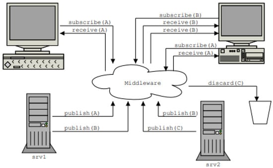Hence, in heterogeneous multi-robot systems, the development of a middleware arises to alleviate the complexity of communication and control. A common alternative is to use the “publication and subscription” model, in which the exchange of labeled information by topics takes place, allowing multiple connectivity between different devices [], as shown in Figure 3.