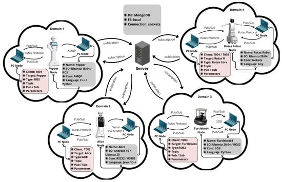Some robotic systems have topics with the same name and make reference to the same type of information; such is the case of the Pepper robot, Turtlebot4, Turtlesim, and RUTAS robot, which use an ROS as an internal system; however, the communication mode and protocols they use vary due to the versions of their internal systems, as is the case of the Pepper robot with the ROS Melodic version and Ubuntu 18.04 and Turtlebot4 with ROS 2 Galactic and Ubuntu 20.04. In addition, a robot can also have a controller based on another type of operating system, such as the Alice robot, which works with Android 10 and whose communication with the PC Node that belongs to its Domain is given under an Android Debug Bridge (ADB) and socket connection, being in majority very different from the communication modes of the other robots.