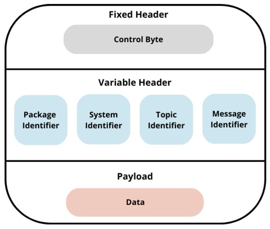 Hence, in order to access and send the information of both Robot Nodes and PC Nodes, locally or remotely, the Nodes make publication requests only related to the topics of interest, and they can also subscribe to the required topics, by building message packages with the structure shown in Figure 5. As a fixed header of the message package, there is a Control Byte that is used to identify the package belonging to the middleware. Then, the message has a variable header with four components: (i) a package Identifier, which indicates the origin of the message, that is, the Node in which it was created; (ii) a System Identifier, which shows the identifier of the Node to which the message is addressed—i.e., the robotic system to which the message is being sent; (iii) a Topic Identifier, which identifies the topic of interest; and (iv) the Message Identifier, which indicates the type of message, publication message, or subscription message. If the Message Identifier indicates a publication message, Data are then sent within the payload section, so that another Robot Node or PC Node can subscribe and obtain that information.