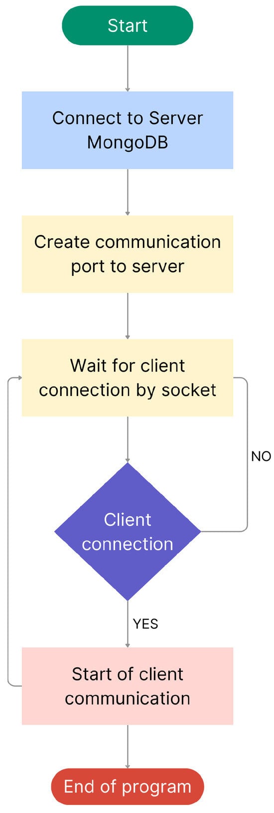 The way the middleware performs information exchange using the publish and subscribe model is described in Figure 6. The Cloud Server starts by initiating a connection with the MongoDB database. If the connection has been established, a communication port is opened to allow connections between the Nodes (clients) and the Server, and the latter waits for said connections through the established socket port. If a client (i.e., a Robot Node or a PC Node) enters, the communication with said client is prepared.