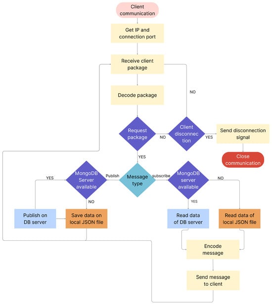 Once communication between the client and the Server has been established, the program requests the client’s IP and connection port, and then receives the messaging package containing the client’s query. Then, the message is decoded and analyzed to determine if it is a request that meets the characteristics of the created communication protocol. If the received package does not comply with the protocol, it may be that the client is sending a disconnect message, so the Server must close the connection with the client, but if is not, that package is only discarded, for example, in the case of a package that was misdelivered due to the network. In the case that it is an exchange request, it must be analyzed whether the message is a publication or a subscription, as Figure 7 shows.