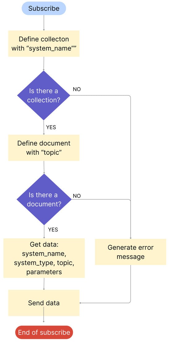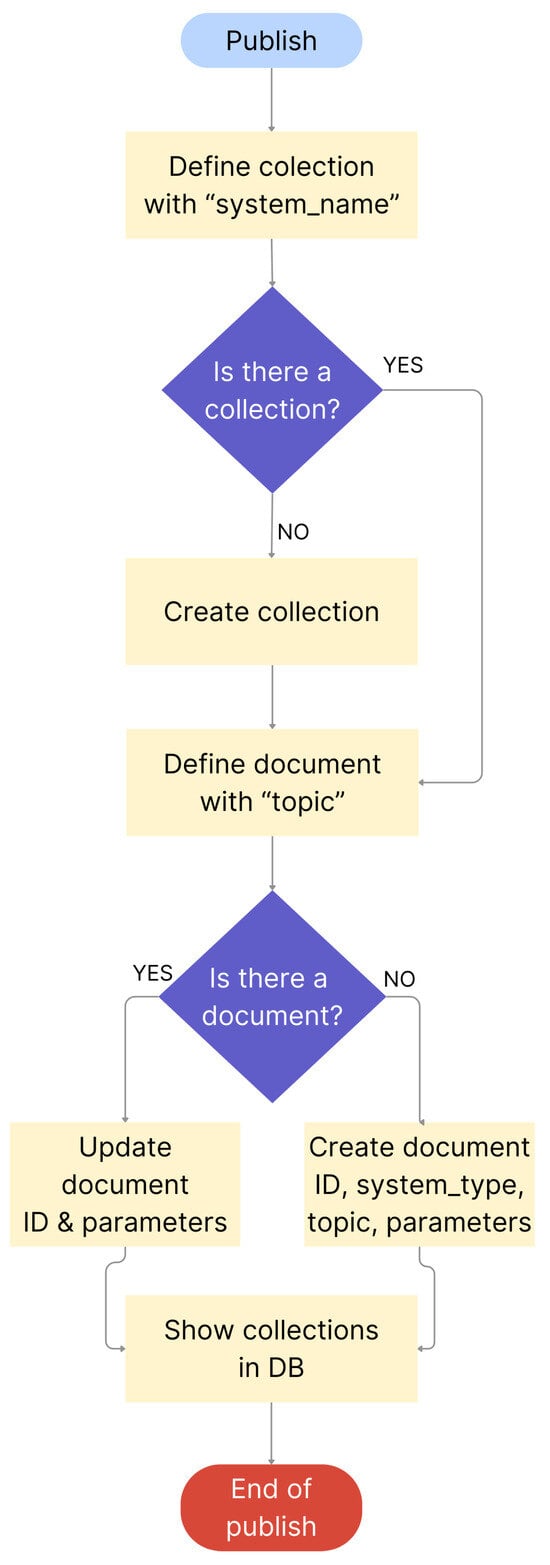 Figure 8. Publish process in Server flowchart. - In the case of a subscription, the process to access the database is similar in terms of the queries that are made. A Collection is defined using the System Identifier; if it does not exist, an error message is generated. On the other hand, a database Document is defined using the Topic Identifier; similarly, if it does not exist, an error message is generated. If the Collection and the Document exist, then the data contained in the message are extracted to be sent to the client (see Figure 9). Another option that the Server has is to use the data stored in its Local File System, in case it does not have a connection to the database.
