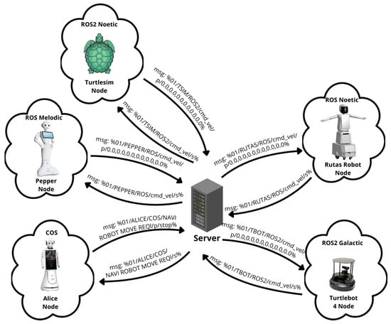 Heterogeneity and efficiency are just two of the key issues that are relevant when choosing or developing the integration of multi-robot systems []. Given that the environments where robots and different environmental sensors operate are highly interconnected and distributed, the need to integrate robotic systems at both the software and hardware levels must be considered; that is, each functional part becomes an active and even independent member in the system []. Moreover, if the robotic systems work under different communication architectures, they might not be capable to establish a connection between other systems due to the different protocols and subsystems with which they work, which generates an incompatibility problem.
