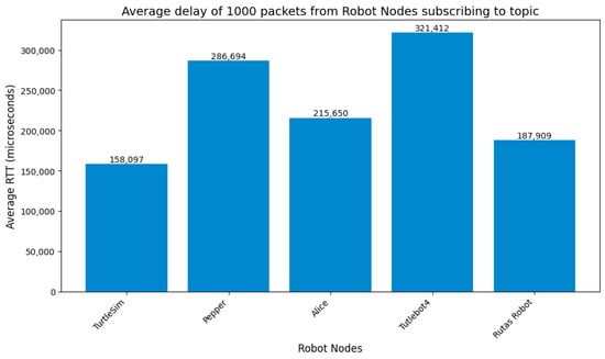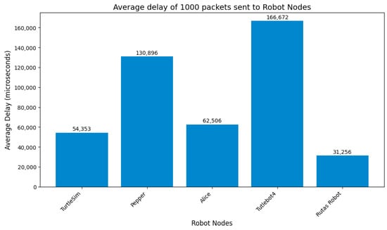 In both processes, the fastest communication times are those for Robot Nodes that have better hardware, such as Turtlesim, the Server, the RUTAS robot, and the Alice robot, in contrast to Turtlebot4 and the Pepper robot, which have more limited hardware. However, the worst average time is near 320 ms, which is considered a good time for real-time applications [,].
