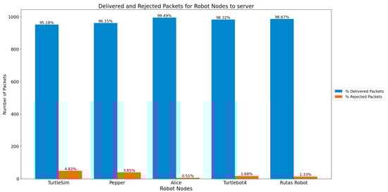 It was also analyzed how many packages in total were delivered from the Robot Nodes and received by the Server, both in publication mode and subscription mode. As shown in Figure 13, delivered messages from Robot Nodes had a high percentage of packages successfully received by the Server (up to 99.49%), with the lowest success rate associated with those delivered from the Turtlesim Node (95.18%), this being due to a possible saturation in the communication, since this Robot Node works inside the same Server.