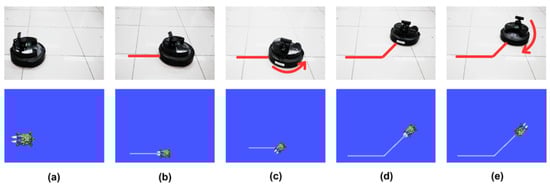 Figure 14 illustrates the movements performed by Turtlebot4 (images above) and Turtlesim (images below). Both Robot Nodes start at rest (Figure 14a); then, the topic indicates a forward movement for 2 s; thus, they move in a straight line for a certain distance (Figure 14b). For both cases, the distance traveled varies given the robots’ properties (one of them can move faster than the other); afterwards, the command is to turn—approximately 45 degrees (Figure 14c); the angle of the turn is not exact due to the angular velocity; then, the topic indicates a forward movement in a straight line with the same speed for 1 s (Figure 14d); and finally, the robot makes a turn of approximately 180 degrees (Figure 14e).