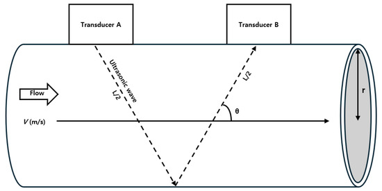 Figure 1 shows the diagram of the clamp-on ultrasonic flowmeter, illustrating the path of the ultrasonic signals and the placement of the transducers [16,17]. This ultrasonic flowmeter can calculate the flow velocity using the following equation. Here, L represents the length of the path of ultrasonic propagation, v is the velocity of the flow, denotes the angle between the direction of the fluid flow and the propagation of the ultrasonic signal, and c indicates the speed of sound in the fluid.