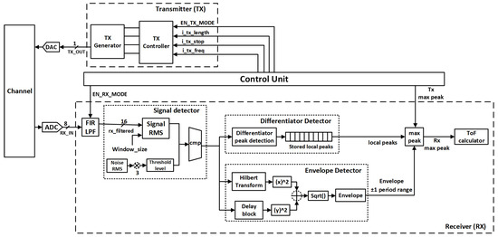 The selected peak represents the point with the highest energy among the detected peaks in the valid region. This peak is then used for the ToF estimation. By combining the differentiator’s and the envelope’s valid ranges, the proposed method achieves robust and accurate ToF estimation, even in noisy or attenuated signal environments. This approach also minimizes computational overhead by focusing only on the most significant features of the signal.
