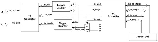 where is the central frequency, is the period, and is the angular frequency. The design of the transmitter enables precise frequency generation and flexible signal control, resulting in an effective response to various flow measurement conditions. To achieve this, the TX controller utilizes parameter registers to configure control signals dynamically. The primary control signals include EN_TX_MODE, i_TX_STOP, i_TX_LENGTH, and i_TX_FREQ. Specifically, EN_TX_MODE reduces energy consumption by making it active only on transmission. In addition, i_TX_STOP allows for precise control by permitting an immediate shutdown when it wants to stop transmission. i_TX_LENGTH reduces unnecessary signal output by dynamically adjusting the length of the transmission signal. Meanwhile, i_TX_FREQ allows for real-time adjustments of the transmission frequency to generate signals suited to the characteristics of the ultrasonic sensor. This allows for the selective utilization of sensors that operate optimally within specific frequency ranges. This design supports various flow measurement conditions in wireless sensor network (WSN) environments and reduces energy consumption, making it suitable for resource-constrained WSN applications.