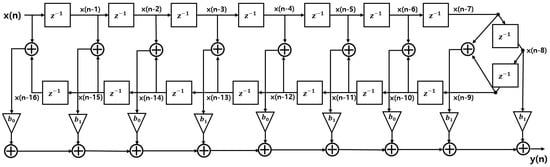 The signal received may be affected by high-frequency noise and electromagnetic interference during propagation through the medium. This system employs a digital low-pass filter (LPF) to mitigate these effects. The LPF allows only low-frequency signals below a cut-off frequency of 2.5 MHz to pass and is implemented based on a 17-tap FIR filter. Figure 4 shows the VLSI architecture of the 17-tap LPF, designed for efficient hardware implementation in this system [21]. Utilizing a symmetric structure reduces the number of multipliers by half, lowering the hardware complexity. Furthermore, the LPF maintains a fixed cutoff frequency, ensuring that the filter’s design complexity does not increase even when the frequency of the transmitted signal changes.