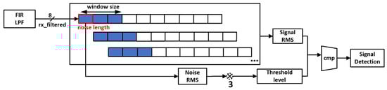 After pre-processing with the low-pass filter (LPF) to reduce noise and interference, the next step involves detecting the presence of the signal received. In this system, a windowing-based power detection method is applied to determine the presence of the signal received [22]. Figure 5 illustrates the windowing-based power detection process. The received signal is sequentially input sample by sample through a shift register. After storing samples equal to the defined window size, the energy within that interval is calculated to detect the signal.