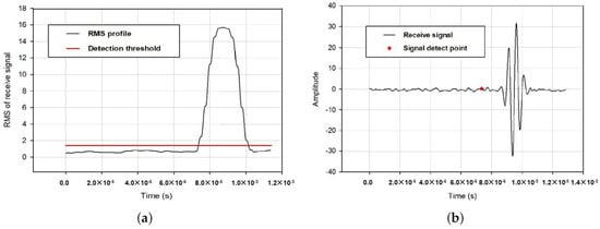 In addition, since the amplitude of the transmitted signal is zero during the initial interval (one cycle), only noise exists in this section. Therefore, the noise RMS is calculated based on this interval. The signal detection threshold is set using the noise RMS value, which is defined as follows [24]: