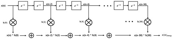 Following signal detection, the proposed VLSI architecture utilizes Hilbert transform-based envelope detection and differentiator-based parallel peak detection. This architecture optimizes the previously described algorithm from a hardware implementation perspective, aiming for real-time signal processing with low complexity. To implement the Hilbert transform for envelope extraction, the architecture uses a 31-tap FIR filter, as shown in Figure 7. The FIR filter leverages the symmetry of its coefficients, where , allowing the architecture to use only half the number of multipliers while maintaining the same performance. This optimization significantly reduces computational complexity and conserves hardware resources.