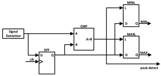 In parallel, the proposed hardware architecture for the differentiator-based peak detector is shown in Figure 8 [25]. This architecture efficiently identifies the local maxima and minima by processing the input signal samples sequentially. It is suitable for environments with limited resources as it is lightweight due to the low use of hardware resources such as comparators, latches, and D flip-flops. Each sample is compared to the previous sample to determine whether it is a local maximum or minimum, and the results are stored in the latch to ensure accuracy. D flip-flops align input signal samples to the clock to ensure stable sequential processing and reduce hardware complexity for real-time signal analysis. Parallel design can simultaneously perform envelope extraction and peak detection, improving the efficiency and real-time performance of the time-of-flight (ToF) estimation system and minimizing computational load.