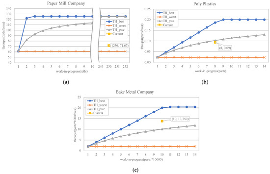| Internal Benchmarking | Raw process time () Bottleneck rate () Current WIP () Current throughput () | “How is the current performance of the company?” Comparison of current performance to best case, worst case, and practical worst case (Figure 2) |