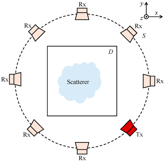 Figure 1 illustrates the 2D setup for the microwave imaging problem: the scatterer is placed in the domain of interest (DOI) D, while a set of sensors on a circular boundary denotes the locations S of transmitter and receiver antennae. Each transmitter illuminates the domain with an incident wave, and the forward solver calculates the total electric field throughout D. After enough time steps, the fields reach a steady state, and the scattered signals collected at the receiver antennae are then used for the inverse problem.