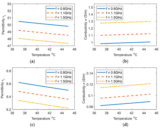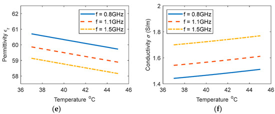 As shown in Figure 2, the relationship between temperature and dielectric properties is approximately linear in the range of 37 °C to 45 °C. Specifically, relative permittivity decreases with increasing temperature, while conductivity shows a positive correlation. For simplicity, we adopt a linear approximation similar to [10]. In Figure 2, the permittivity and conductivity variations with temperature are presented for three tissue types: liver, fat, and blood. As the temperature increases from 37 °C to 45 °C, permittivity decreases by 1.68% (Figure 2a), 2.15% (Figure 2c), and 1.98% (Figure 2e). Similarly, conductivity increases by 6.44% (Figure 2b), 8.81% (Figure 2d), and 7.87% (Figure 2f). Based on the trends observed in Figure 2, the temperature–permittivity coefficient is −0.25%, meaning that permittivity decreases by 0.25% for every 1 °C increase relative to 37 °C. Likewise, the temperature–conductivity coefficient is +1%, meaning that conductivity increases by 1% for every 1 °C increase relative to 37 °C.