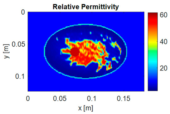 A circular tumor of 7.5 mm radius is placed at position (−15, 0) mm, as illustrated in Figure 4. The frequency-dependent relative permittivity of the breast tumor is described by the ex vivo model in [30]. Combined with the temperature-dependent dielectric properties of porcine blood mentioned above, the tumor’s dielectric properties in this study are established according to Figure 2e.