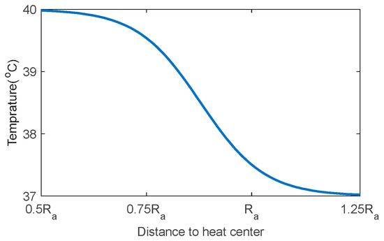 A sigmoid function is employed to simulate the heating process and create smooth temperature transitions at the heating boundaries, as shown in Figure 5. Using the tumor center as the origin, the heated region has a radius of 0.5Ra, where Ra denotes the tumor radius. A transition zone is defined as an annular region with inner radius 0.5Ra and outer radius 1.25Ra. All regions beyond 1.25Ra from the heating center maintain a baseline temperature of 37 °C. In this study, the heating process increases the temperature from 37 °C to 45 °C in 1 °C increments.