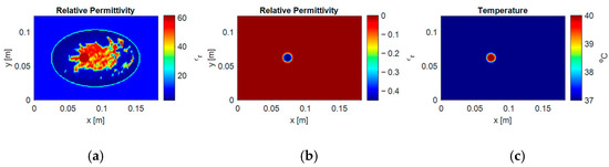 Taking the case of 40 °C heating as an example, we have the following: Figure 6a shows the relative permittivity distribution of the heated breast phantom, Figure 6b illustrates the temperature distribution across the imaging domain, where the central heated region maintains a uniform temperature of 40 °C while the transition zone exhibits a smooth temperature decrease to 37 °C with increasing distance from the center. The implementation of such transition zones is supported by previous heating studies using breast phantoms [10,33]. Figure 6c demonstrates the resulting changes in relative permittivity across the imaging domain due to this heating pattern.