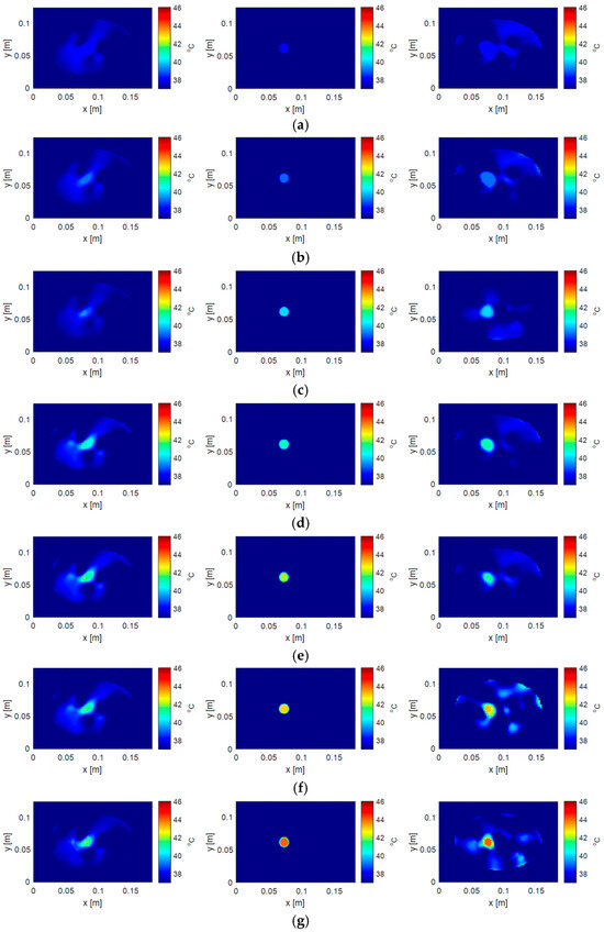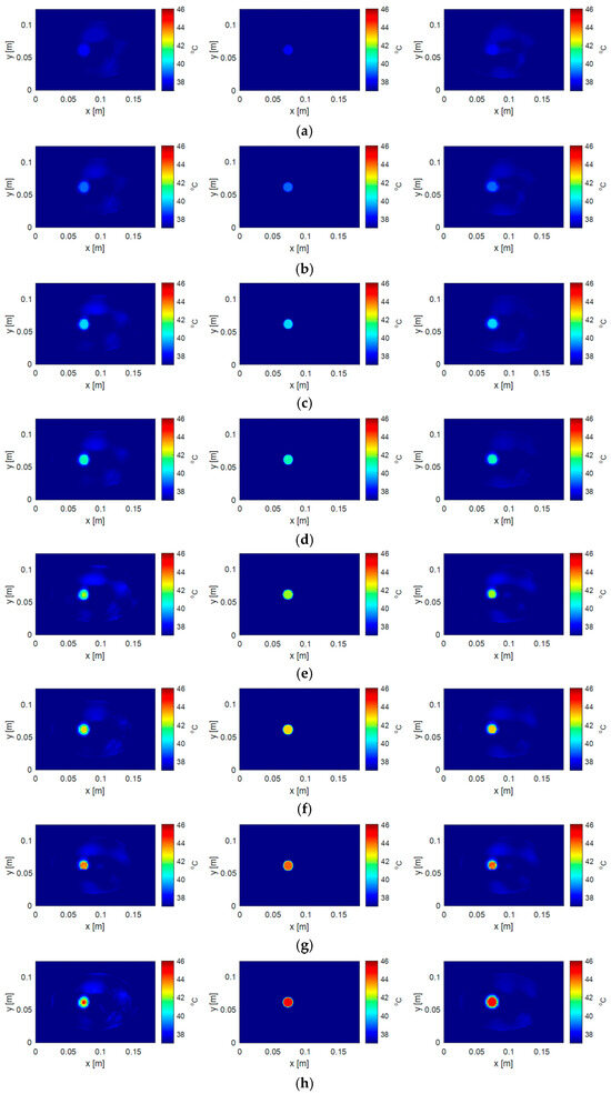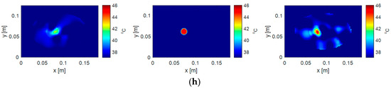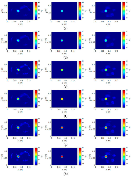 Comparison of temperature reconstruction results at different heating levels (38–45 °C). For each temperature level (a–h), the panels show the following: temperature distribution reconstructed by the BA method (left), true temperature distribution (middle), and temperature distribution reconstructed by the proposed method (right). Temperature values are indicated by the color bar in degrees Celsius.