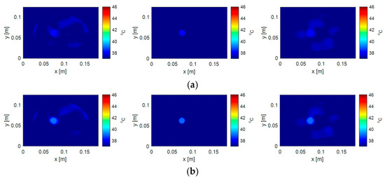 The temperature reconstruction accuracy is evaluated using two relative error metrics obtained from Equation (15): ξb and ξh, where the subscript b indicates values within the whole breast, and subscript h indicates values within the heated region (defined as a circular area with radius 0.5Ra centered at the tumor position). Table 1 compares these relative errors for both methods across different temperature levels and the mean reconstructed temperature Th within the heated region.