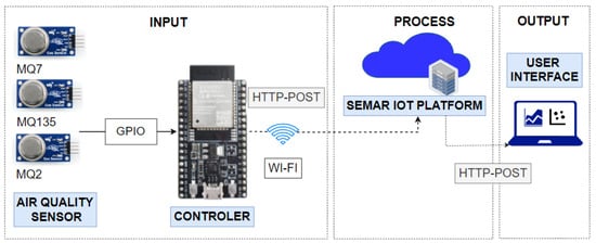 The sensors are connected to the controller that processes the data received. This data is then sent over the network to a server such as the SEMAR IoT application server [20,28]. With real-time monitoring capabilities and various AI models, it is possible to predict air quality in the future.