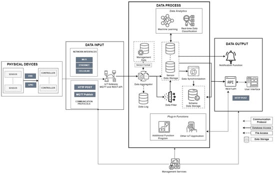 In 2022, Panduman et al. introduced the SEMAR IoT Server Platform, an innovative framework designed to enhance the integration and interoperability of various IoT application systems [20]. This platform facilitates real-time data aggregation, synchronization, and classification by utilizing machine learning techniques and supporting Big Data environments. SEMAR is built to be flexible and interoperable, accommodating both direct sensor connections and network-based data transmissions. The platform’s modular design allows for the easy implementation of plug-in functions, enabling seamless integration with external IoT systems via REST API services. To evaluate its performance, SEMAR was tested by integrating five IoT systems, including air-conditioning guidance, indoor localization, water quality monitoring, environment monitoring, and air quality monitoring. The study highlighted SEMAR’s advantages over existing IoT platforms, particularly in terms of flexibility, interoperability, and ease of integration, demonstrating its potential to serve as a robust backbone for smart city applications.