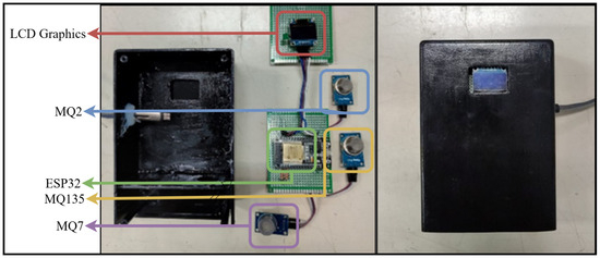 The hardware of the air quality monitoring system as shown in Figure 3 consists of three sensors and one microcontroller. As sensors, MQ7 [51] is adopted to measure CO, MQ135 [52] is for NO2, and MQ2 [53] is for HC. These sensors are connected to the ESP32 microcontroller [54]. It acts as the central processing unit to collect and transmit data. In addition, a Wi-Fi module and a Bluetooth module are integrated into the ESP32 microcontroller to enable wireless data transmission from sensors to a cloud server or mobile devices. The system is powered by a 5 V battery with a current of 0.5 A. Other devices such as resistors are necessary for integration of sensors into the microcontroller.