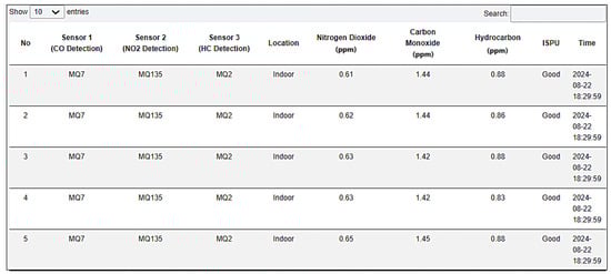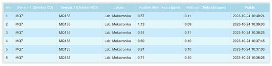 As the user interface, the dashboard for monitoring and managing the air quality monitoring system is designed to provide users with a comprehensive and real-time overview of environmental conditions. The dashboard has key metrics such as pollutant levels of CO, NO2, HC, air pollution standards index (ISPU), locations and current time. Users can easily monitor their trends over time, daily summary data and historical data, and download data in csv format for further analysis on a PC. This design ensures that users can monitor air quality efficiently, receive data in a timely manner, and make informed decisions to protect their health and well-being.