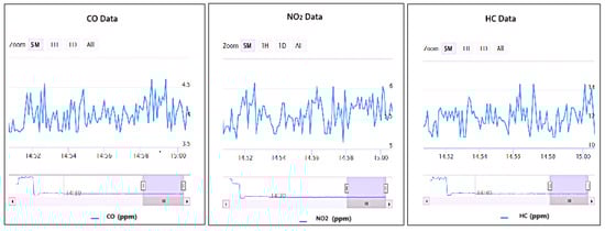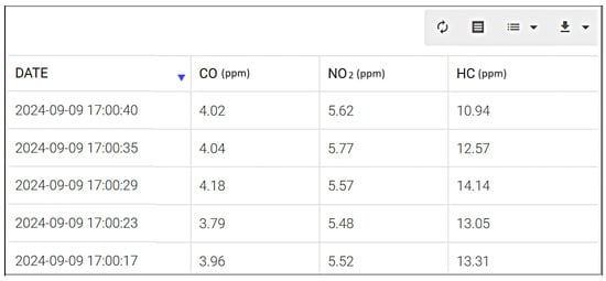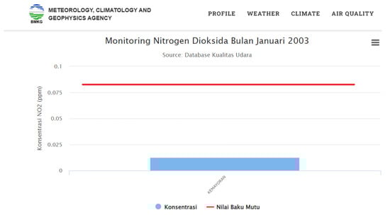 Air quality can be classified by the Air Pollutant Standard Index (ISPU) category with a certain range of numbers in their averages of 24 h. This value is based on the Regulation of the Minister of Environment and Forestry of the Republic of Indonesia Number P.14/MENLHK/SETJEN/KUM.1/7/2020 [29]. The values in Table 1 are adjusted based on the average values of the temperature and air pressue that are referred from the Indonesian Meteorology, Climatology, and Geophysics Agency (BMKG) website [49]. This category includes Good with a range of 0–50, Medium with a range of 50–100, Unhealthy with a range of 101–200, Very Unhealthy with a range of 201–300, and Hazardous for values above or equal to 301. Table 1 shows the maximum values for each ISPU range of three typical pollutants, CO, NO2, and HC. These values are given in units of μg/m3.