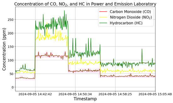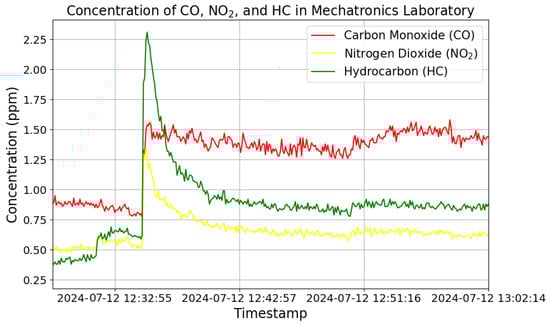 Enhancing campus environments by tackling air pollution is an essential initiative to promote health, safety, and academic success within educational institutions [1,2,3]. However, air pollutants on university campuses can often arise from activities in laboratories such as welding, practical works involving automobile engines, and chemical experiments. Each of them may emit harmful substances such as particles and nitrogen oxides [4,5,6]. These emissions have the potential to lower air quality, which puts students and staff at serious risk of respiratory diseases, as well as affecting their general comfort and cognitive functions [7,8,9].