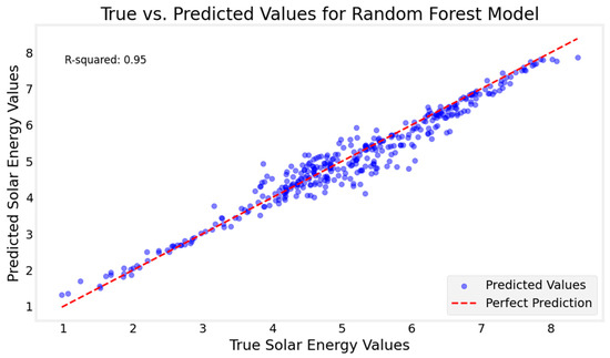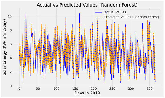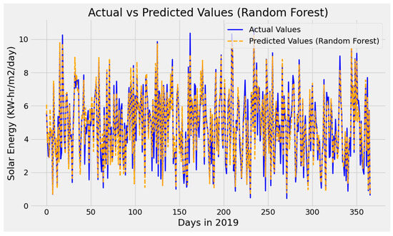 The figure shows that the bagging regressor ensemble method produced the best results of the seven methods with a mean R-squared value of 0.9206. Then, we expanded our experiment to other cities in the state of Florida using solar irradiance data from tilted solar panels in 2019. Our goal is to increase the generalizability of the model. Ridge regression was incorporated into all machine learning methods using the datasets from Boca Raton, Florida, as the training data for our model to address the critical issue of overfitting. In addition, five-fold cross-validation was performed on the dataset for each city. By penalizing large coefficients, ridge regression introduces a regularization term to the loss function, which helps to balance model complexity and generalizability. The use of ridge regression aligns with the primary goal of this research: to develop predictive models that generalize well to unseen data. By integrating ridge regression into all methods, this study ensures that the models are not only accurate but also robust and interpretable. This choice demonstrates a commitment to producing models that can withstand the complexities of real-world data while avoiding the pitfalls of overfitting. The prediction results for the city of Orlando using the Random Forest machine learning model are presented in