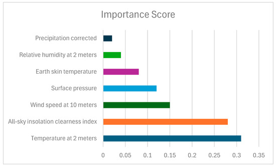 To further understand the contribution of input features to the model’s predictions, we conducted an analysis of feature importance using the Random Forest algorithm, which inherently provides a measure of feature significance based on the decrease in impurity (Gini importance). The results revealed that temperature at 2 m and the all-sky insolation clearness index were the most significant predictors, as they strongly influence solar irradiance variability. Features such as wind speed at 10 m and surface pressure showed moderate importance, while relative humidity and precipitation had a lesser but still notable impact. The Random Forest algorithm evaluates the significance of each input feature by measuring its contribution to reducing impurity in the decision trees.