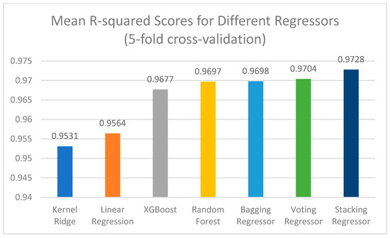 The figure shows that the stacking regressor ensemble method produced the best results of the seven methods with a mean R-squared value of 0.9728.