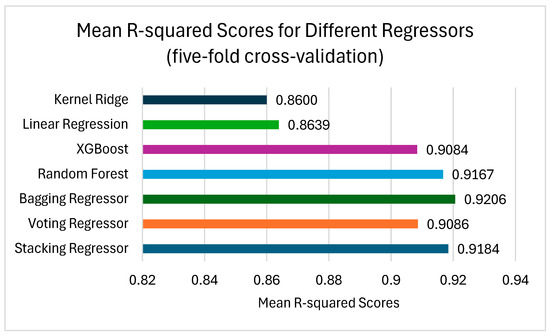 Table 8 illustrates the mean R-squared values of the Five folds for the three ensemble methods with five-fold cross-validation. The stacking regressor provided the best prediction results of the ensemble learning methods.