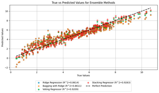 Figure 18 presents the bagging ensemble regressor model using a scatter plot for Tampa. The stacking regressor performed the best out of the three ensemble learning methods with an R-squared value of 0.9571.