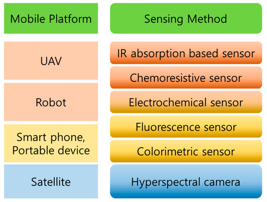 There have been various studies and reviews on chemical substances and pollutant detection using mobile platforms such as smartphones, robots, and drones [3,4,5,6,7,8]. However, reviews on the advantages and disadvantages and applicability according to the characteristics of the platform and sensors are somewhat limited. In this paper, we reviewed the results of various chemical detections available on mobile platforms including drones and smartphones, and the analysis of the sensing results utilizing machine learning. We try to provide a comprehensive understanding of applicable technologies and their characteristics according to mobile platforms. This topic covers a very wide range of specialized fields such as material science, aeronautical engineering, physics, chemistry, environmental engineering, electronics, and machine learning, and it is difficult for experts in one field to grasp the overall content. Thus, we illustrate relatively simple concepts with figures and pictures to help experts in various fields understand the overall concepts comprehensively.