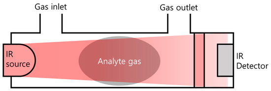 There is growing interest in equipping drones with gas sensors, as they can provide long-term, continuous monitoring of sources of hazardous gas emissions in industrial areas. They also have the advantage of being able to observe areas that are geographically difficult for humans to access, such as landfills, wastewater treatment plants [9,10], military border areas, and areas with frequent volcanic eruptions. Although various gas sensors can be mounted on drones, the chemical sensors which are most commonly utilized on UAVs are infrared sensors that use a laser of a specific infrared wavelength to detect the concentration of molecules by absorption of light at the wavelength (Figure 2) [9,11,12].