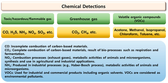 UAVs equipped with gas sensors can provide data on atmospheric greenhouse gas components (e.g., CH4, CO2) in the lower troposphere. These measurements are much less expensive than manned aircraft, can scan larger areas of space than fixed monitoring methods, and can provide better spatial resolution than satellite-based measurements [13]. In the NDIR method, absorption by specific molecules can be measured immediately when air is drawn into the chamber through an air intake either built-in on the drone or a pylon mounted on the base of a drone, making it relatively easy to obtain gas concentration mapping. Figure 3 shows examples of gases and volatile organic compounds (VOCs) that need to be monitored. The emission sources are explained together.