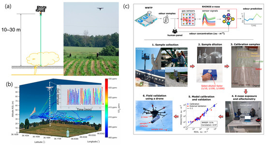 Examples of chemical detection using drones. (a) Detection of methane leakage using backscattered-tunable diode laser absorption spectroscopy (Backscattered-TDLAS) [11]. Copyright 2021 by Iwaszenko et al. Reprinted with permission. (b) Response of NDIR CO2 detector during the flight of small unmanned aerial systems (quadcopter for vertical profiles and fixed-wing for horizontal profiles) with programmed gas release [12]. Copyright 2019 by Schuyler et al. Reprinted with permission. (c) Odor prediction process using e-nose adopted on a UAV [9]. Copyright 2021 by Elsevier. Reprinted with permission.