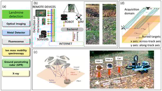 (a) Detection techniques for landmines. (b) The system architecture proposed for surface landmine detection (left) and object detection results of “starfish” (left 3 images) and “butterfly” (right 3 images) landmines. The red rectangles, yellow rectangles, and purple circles indicate correct, wrong, and missing object detection results in the images on the right box [23]. Copyright 2024 by Vivoli et al. (c) Schematic illustration of the ground penetrating radar (GPR) configured with the 1Tx + 4Rx antenna system (left). A photograph of the robotic platform on the linear test path is also shown (right) [24]. Copyright 2022 by Pryshchenko et al. (d) Illustration of the flight path for airborne-based GPR system [25]. Copyright 2022 by García-Fern’andez et al. Reprinted with permission.