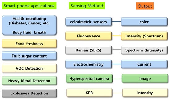 Sensing techniques that can utilize the camera of a smartphone include a colorimetric sensor, fluorometric sensor, surface-enhanced Raman spectroscopy, and surface-plasmon resonance. Figure 7c,d show colorimetric and fluorometric sensors using a smartphone camera [34,35]. In this section, we mainly focus on colorimetric sensors [36].