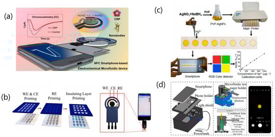 (a) Wireless communication module for electrochemical detection [32]. Copyright 2024 by Boonkaew et al. (b) Additional electrochemical module adapted for a smartphone [33]. Copyright 2021 by Elsevier. Reprinted with permission. (c) Inkjet-printed colorimetric chemical sensor with optical analysis using a smartphone [34]. Copyright 2021 by Elsevier. Reprinted with permission. (d) Microfluidic paper-based fluorometric chemical sensor with optical analysis using a smartphone and attachment [35]. Copyright 2024 by Elsevier. Reprinted with permission.