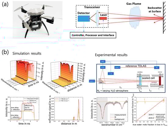 (a) A photograph of a remote methane leak detector (RMLD)-adapted UAV (left) and a drawing of the remote gas detection mechanism (right) [47]. Copyright 2018 by Yang et al. (b) Simulation (left) and experimental (right) results of single-ended TDLAS measurement. The experimental set-up is also shown together [48]. Copyright 2024 by Hansemann et al.